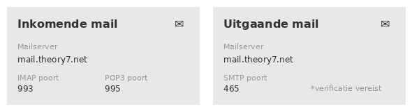 Maak je gebruik van onze eigen IMAP/SMTP e-mailpakketten, dan kun je onderstaande gegevens gebruiken om je e-mail in te stellen.